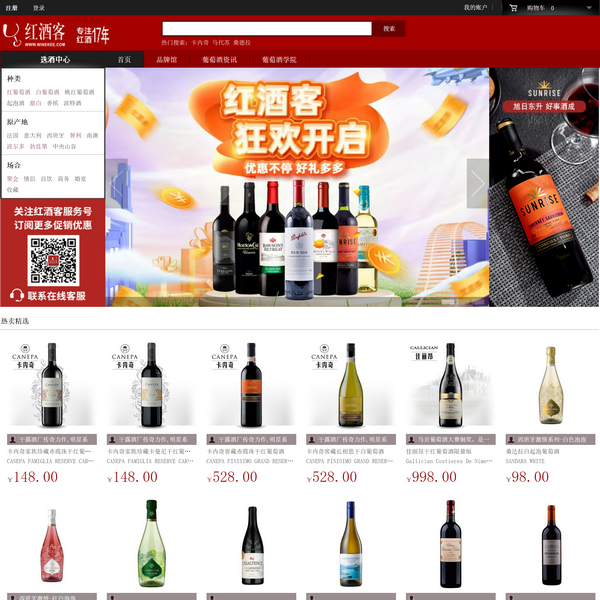 《紅酒客》于2006年4月成立,是上海萬(wàn)客易酒文化傳播有限公司旗下網(wǎng)站。作為一家專(zhuān)注紅酒十余年的葡萄酒網(wǎng)絡(luò)銷(xiāo)售平臺(tái),《紅酒客》目前不僅在線銷(xiāo)售來(lái)自法國(guó)、意大利、美國(guó)、智利、新西蘭、南非等新、舊世界的6,000余款葡萄酒(種類(lèi)包括紅葡萄酒、白葡萄酒、粉紅葡萄酒、香檳、起泡酒、冰酒等);還可提供酒杯、醒酒器、酒鼻子、酒柜等相關(guān)酒器酒具。酒款豐富,包裝安全,支付方式多樣,限時(shí)專(zhuān)人配送!