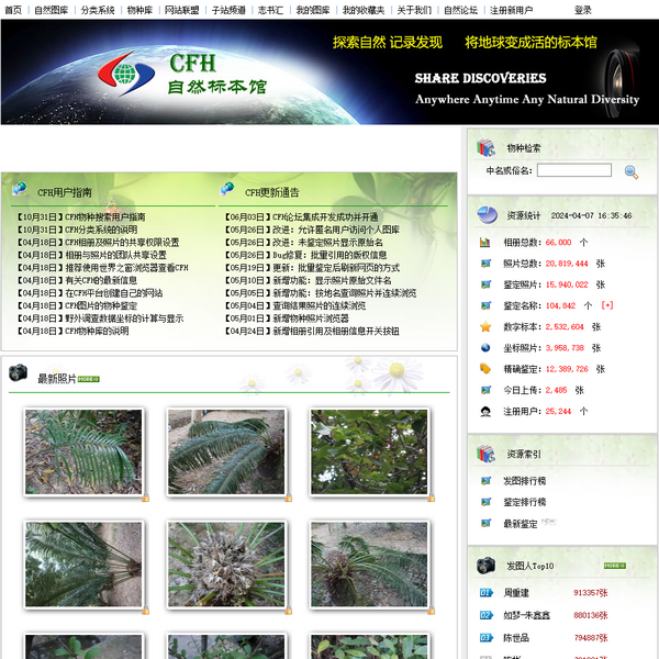 中國自然標(biāo)本館(Chinese Field Herbarium,簡稱CFH)是中國科學(xué)院植物研究所建設(shè)的生物多樣性信息網(wǎng)絡(luò)平臺(tái),致力于為用戶生物多樣性數(shù)據(jù)的采集、管理、利用提供全套解決方案,并將廣泛的志愿者力量綜合起來,推動(dòng)大范圍的生物多樣性本底調(diào)查工作。CFH的原則是公平、公開、志愿、合作、互動(dòng),用戶的數(shù)據(jù)提交與平臺(tái)的服務(wù)提供不以任何經(jīng)濟(jì)利益為目的,但歡迎相關(guān)的研究合作與經(jīng)費(fèi)支持。